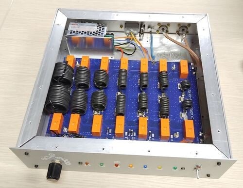 F6GDO : Filtre passe-bas pour ampli décamétrique à partir d'un KIT de chez DXWORLD-e et d'une petite alim à découpage. Le boîtier est de construction OM. Ce filtre sera à la suite d'un module de récupération Kaki.