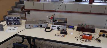 Atelier morse pour les jeunes, explications sur l'histoire de la radio avec une démo sur le cohéreur de Branly et présentation des activités radioamateur avec un TRX de construction OM.